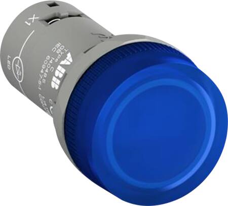 Blå signallampe med sort plastikkrave og integreret LED. 24V AC/DC, Ø 22mm, fra ABB's kompakte serie.