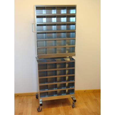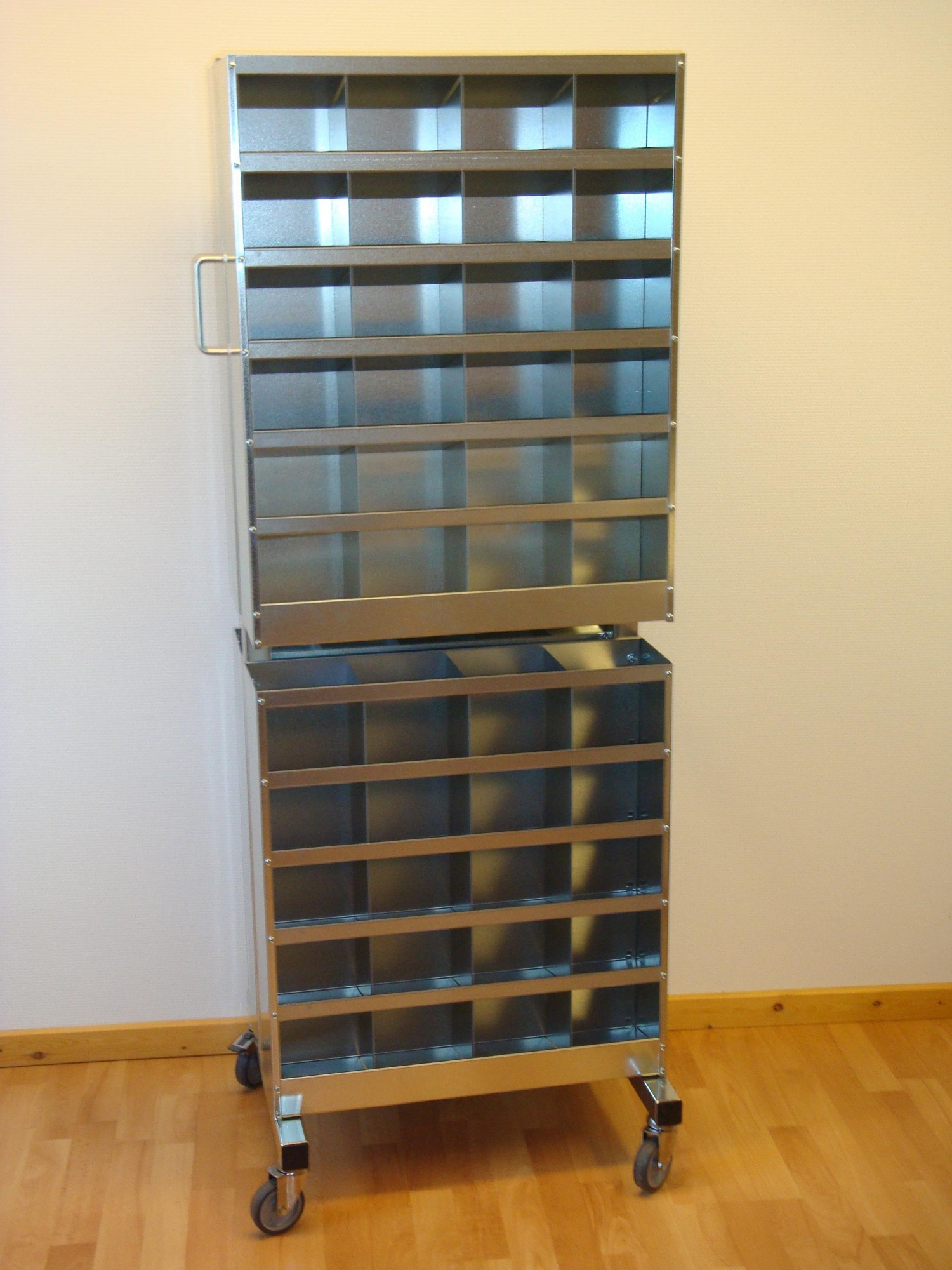 Multireolvogn med 117 rum i galvaniseret stål. Den har 65 rum (B: 120 mm) og 52 rum (B: 150 mm). Med 4 svingbare hjul, hvoraf 2 har bremser. L: 600mm, H: 1.630 mm, B: 500 mm.