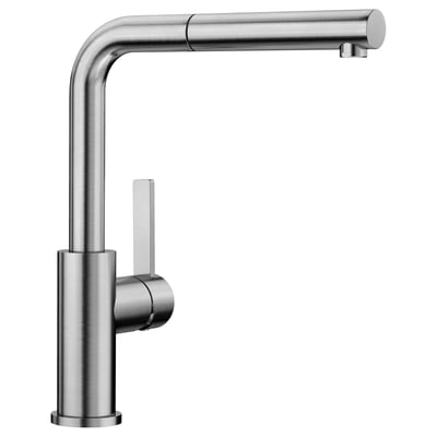 BLANCO LANORA-S køkkenarmatur i rustfrit stål med udtræksbruser og L-tud. Leveres med flexslanger og 3/8" omløbere.