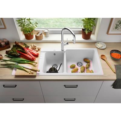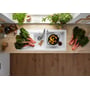 Vasken er designet med to kummer og en praktisk afløbsbakke, hvilket giver god plads til både opvask og forberedelse af mad. Den manuelle afløbsbetjening sikrer nem håndtering af vandstrømmen. Med forborede huller er vasken klar til montering af armatur og eventuelt andet tilbehør.