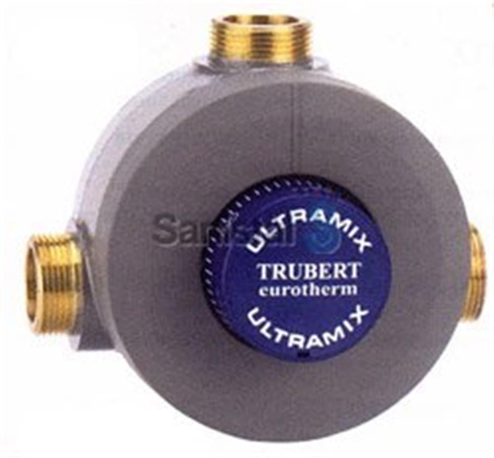 Eurotherm Ultramix termostatisk blandeventil med indbyggede kontraventiler, filtre og skoldningssikring. Med udskiftelig termostatindsats.