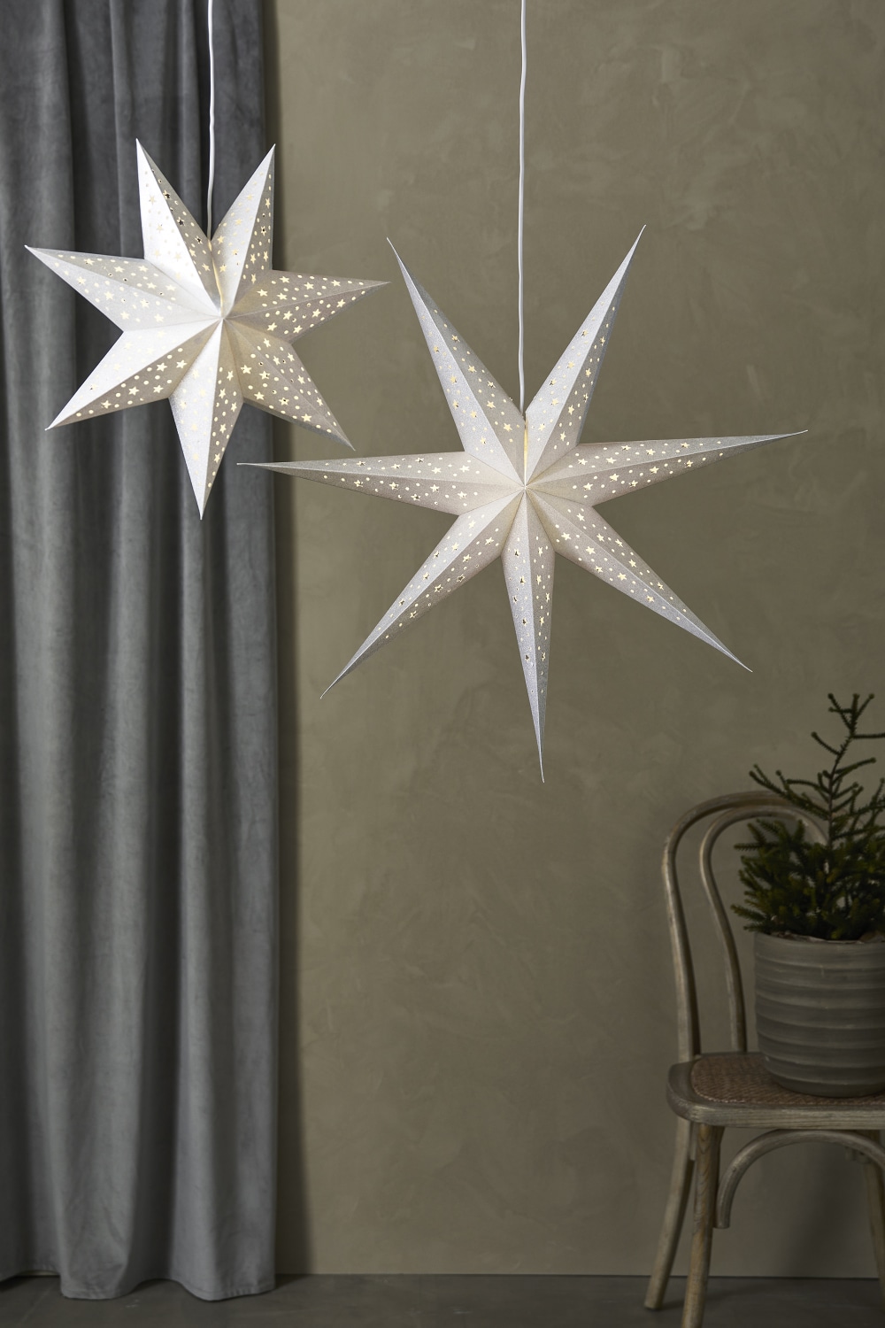 Elegant Blank Pendel Stjerne fra Markslöjd. Skaber hygge med varmt hvidt lys. Perfekt til indendørs brug. Med 6 timers timerfunktion.