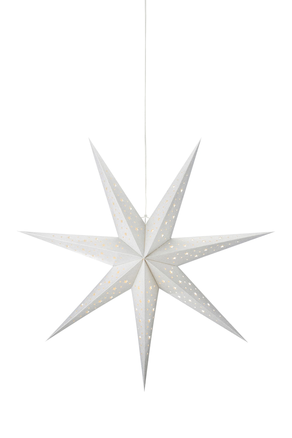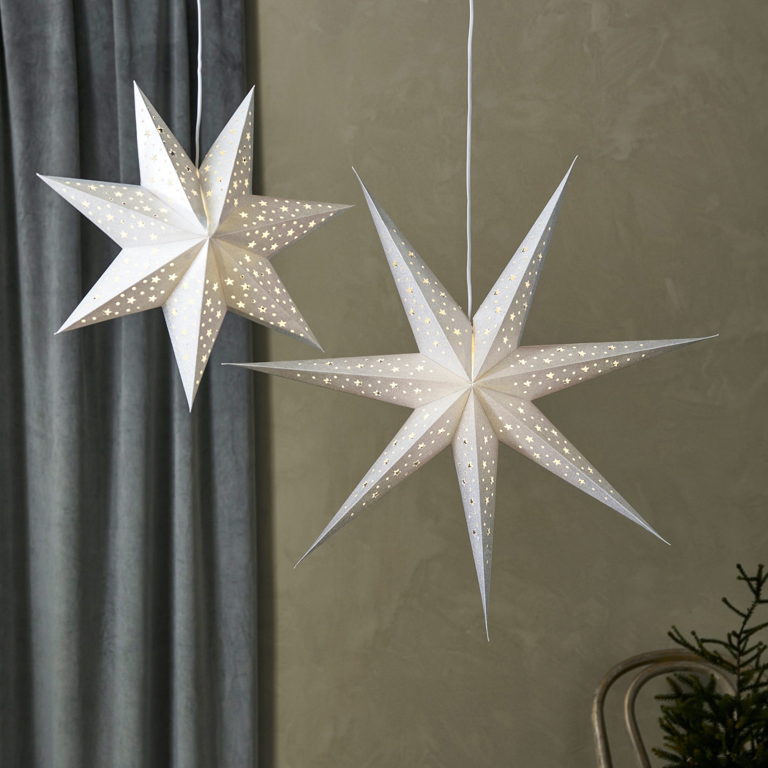 Elegant Blank pendel stjerne fra Markslöjd. Fremstillet med base i plast og skærm i papir. Inkluderer 2 integrerede LED lyskilder med varmt hvidt lys og 6h timer.