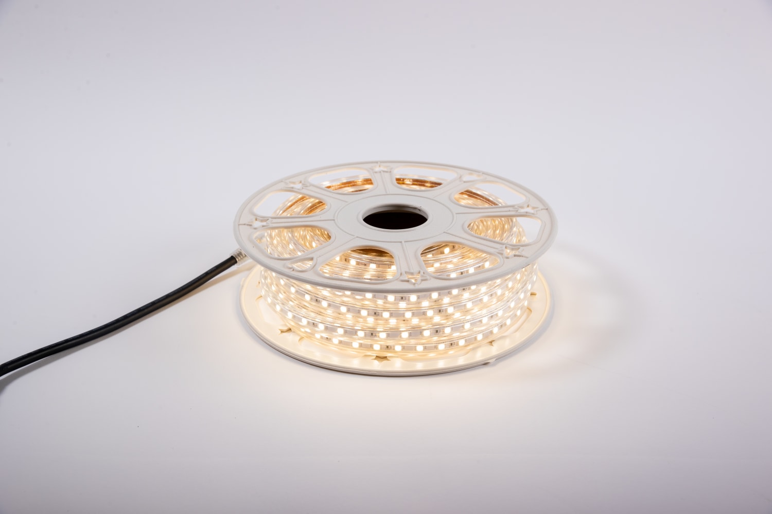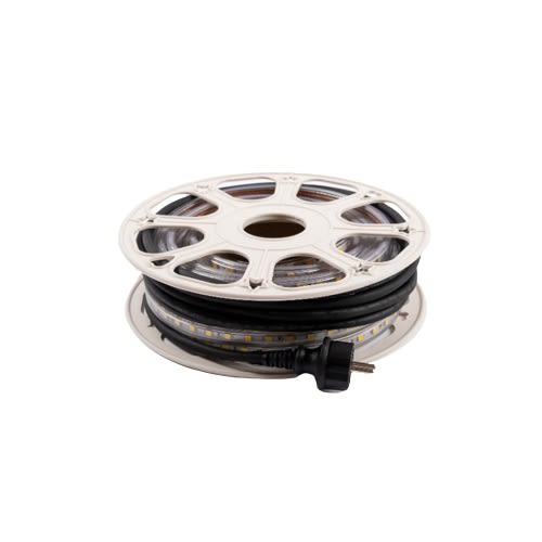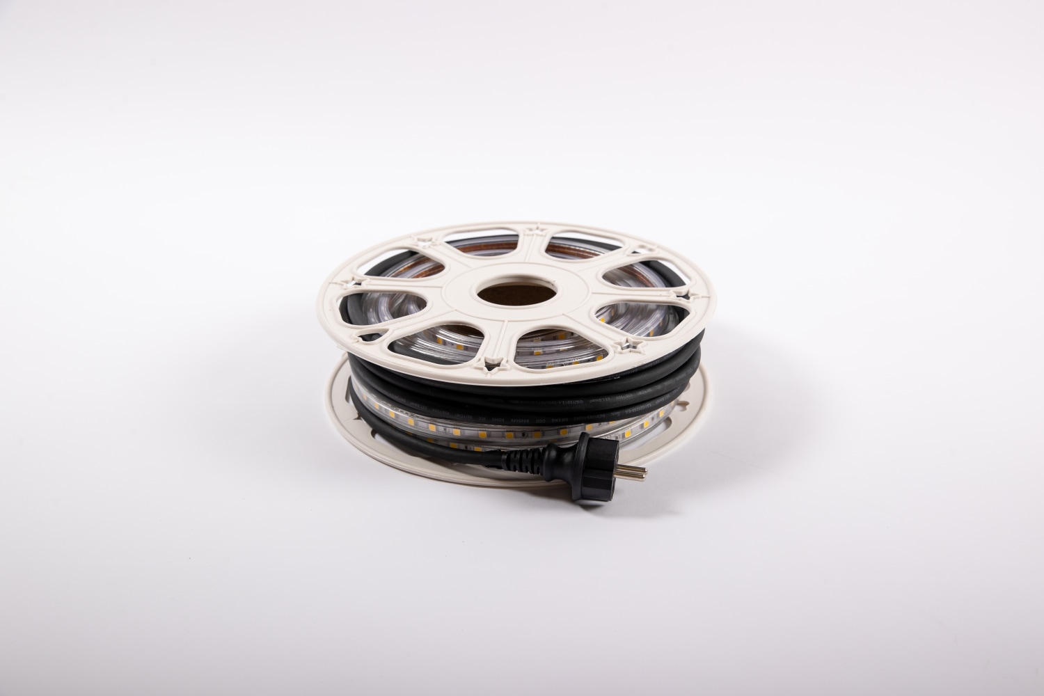LED strippen har en bredde på 14 mm og en højde på 7 mm, hvilket gør den diskret og nem at integrere. Den leveres færdigmonteret med en 4 meter lang H07 tilslutning og opererer på 230V. Med en IP67-klassificering er strippen beskyttet mod støv og nedsænkning i vand, hvilket gør den velegnet til udendørs brug.
