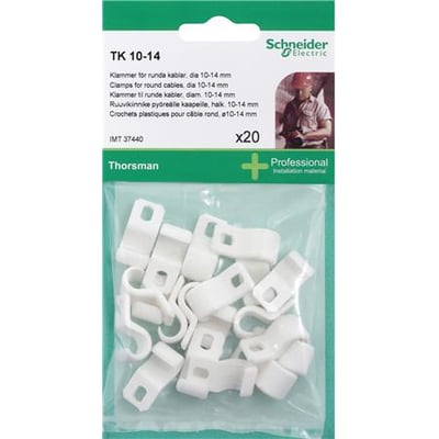 Plastikbøjle til runde kabler eller rør (Ø 10-14 mm). Fastgøres med M6-M8 skrue. Til træ, beton, mursten og gipsplader. Fra Schneider Electric.