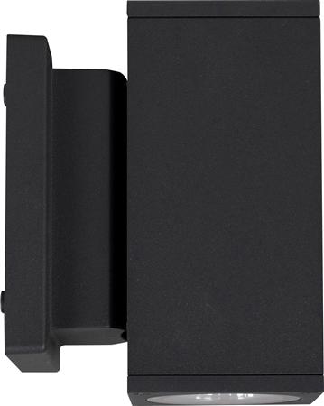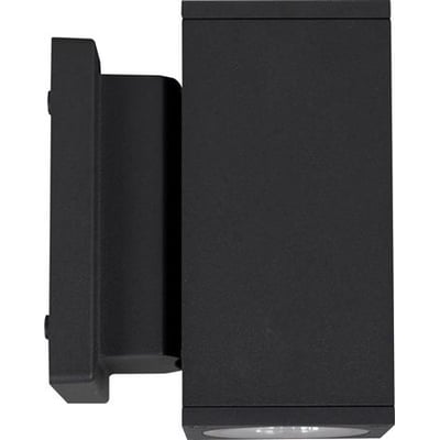 Rektangulært vægarmatur med lysåbning opad og nedad. Indbygget fasedæmpbar aktuator og IP65-klassificering til udendørs brug.