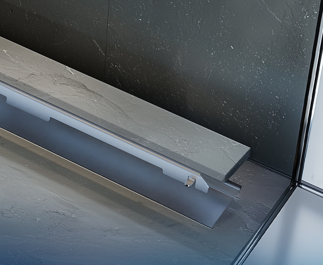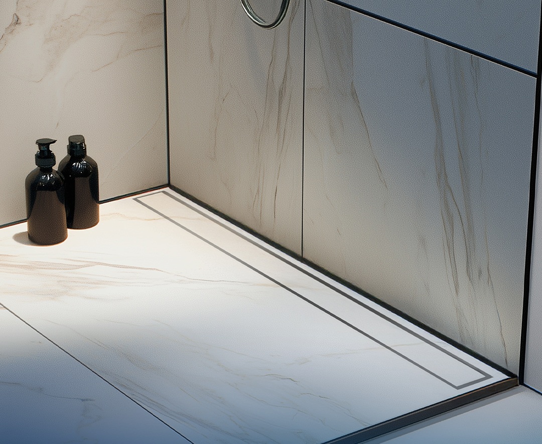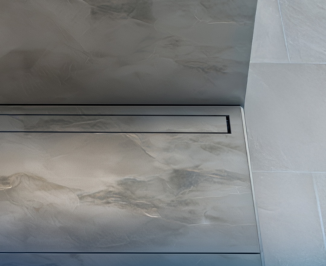 Rustfri afløbsrende med lodret udløb og en længde på 1000 mm.