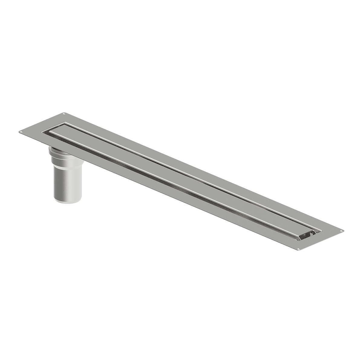 BLÜCHER Waterline Atlantis afløbsrende på 700 mm i længden, med et Ø50 mm lodret udløb. Fremstillet i rustfrit stål (AISI304/EN1.4301) og designet til installation i beton- og flisegulve.
