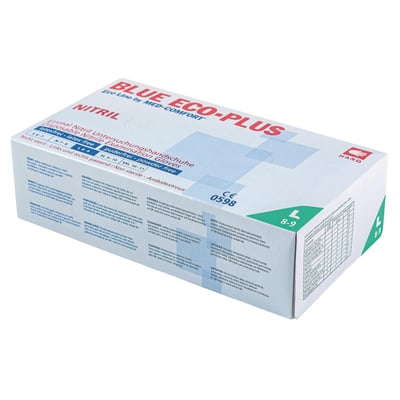 BLUE-ECO-PLUS nitril engangshandske i blå, pudderfri kvalitet. Handsken er godkendt til håndtering af fødevarer og testet i henhold til den medicinske standard EN 455.