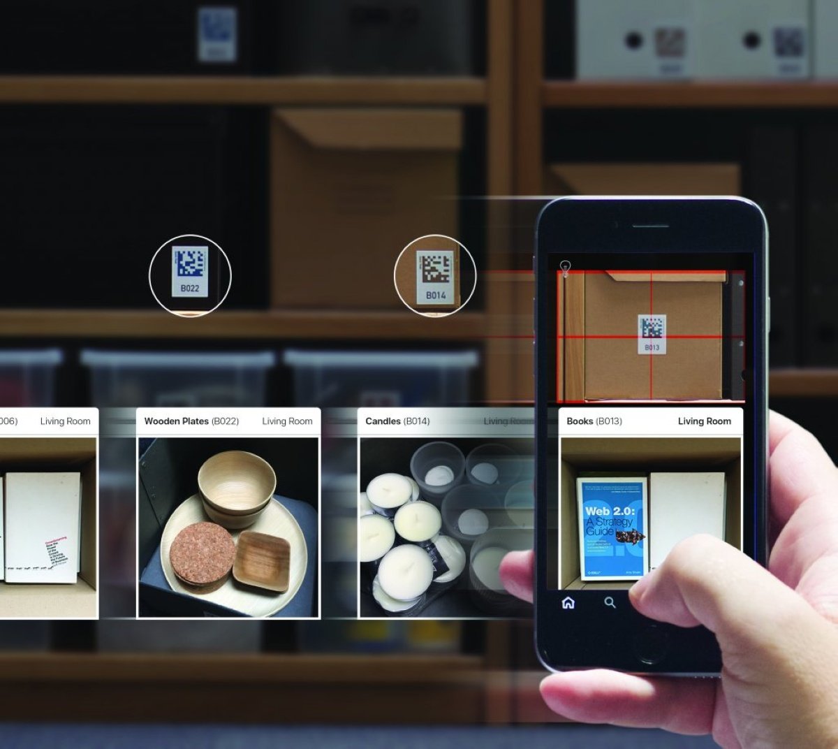 - Scan + Opbevar: Når du har taget dit billede, skal du blot scanne labelen på kassen, hvorefter dine ting automatisk gemmes i dit nye visuelle lager i appen. Opbevar din kasse, og næste gang du skal finde noget, skal du blot åbne din app for at finde dine ting.