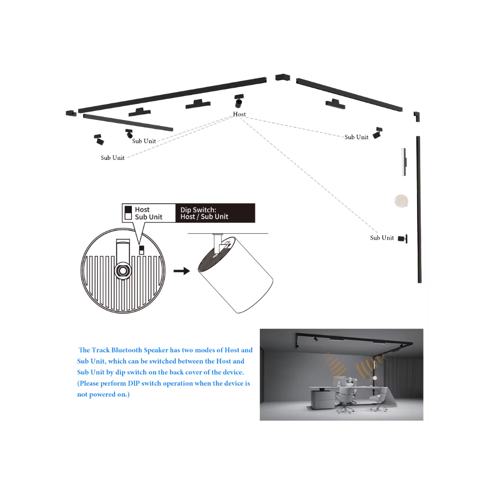 Den er ideel til at skabe den rette atmosfære i butikker, restauranter, kontorer eller hjemmet, hvor både lys og lyd er vigtige elementer. Højtaleren er nem at montere på standard 3-fasede skinner.