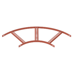 90°-bøjning til marine kabelstige type SL 42 med sidehøjde 25 mm. Med indsvejsede, perforerede trapezsprosser, der er åbne opad.