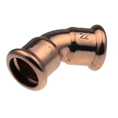 VSH 45° bøjning muffe/muffe er en pressfitting til kobberrør med en diameter på 15 mm. Den bruges til at skabe en 45 graders vinkel i rørsystemet. Pressfittings er en hurtig og sikker måde at samle rør på, uden brug af lodning.