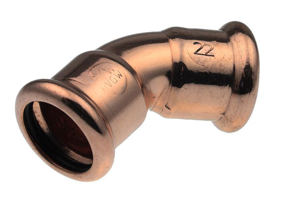 VSH bøjning 45° muffe/muffe, 15 mm cu med o-ring af epdm. VSH XPress kobber er et komplet system af presfittings til drikkevand, varme- og køleinstallationer.