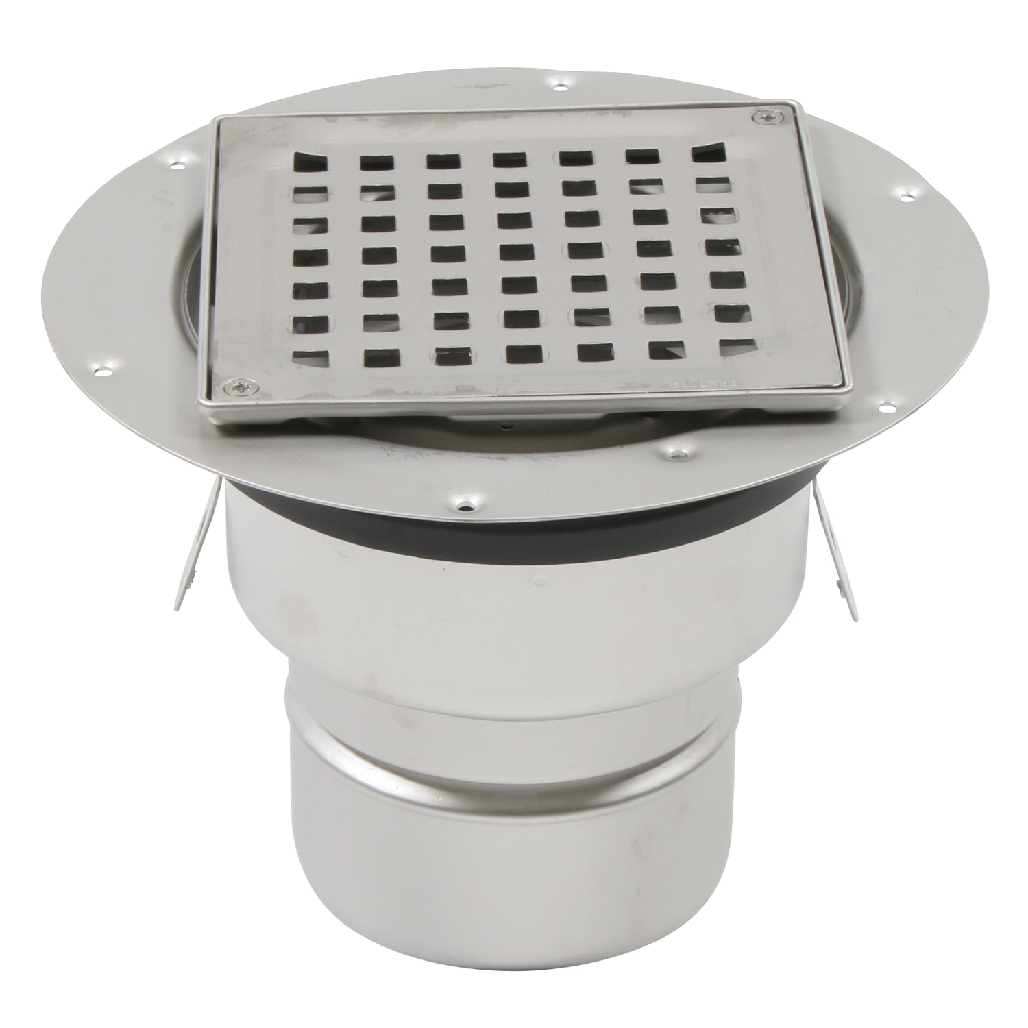 Blücher Square gulvafløb til beton og fliser med klembanemembran. Ramme: 145x145 mm, udløb: Ø110 mm lodret. Fremstillet i rustfrit stål AISI304/EN1.4301.