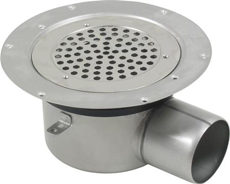 Justerbart Circle boligafløb til vinylgulv med Ø155 mm rist og vandret Ø75 mm afløb i syrefast stål AISI316L/EN1.4404.