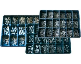 Boltesortiment DIN 933, elforzinket, indeholdende 650 stk. Dimensioner: 33x5x23 cm.