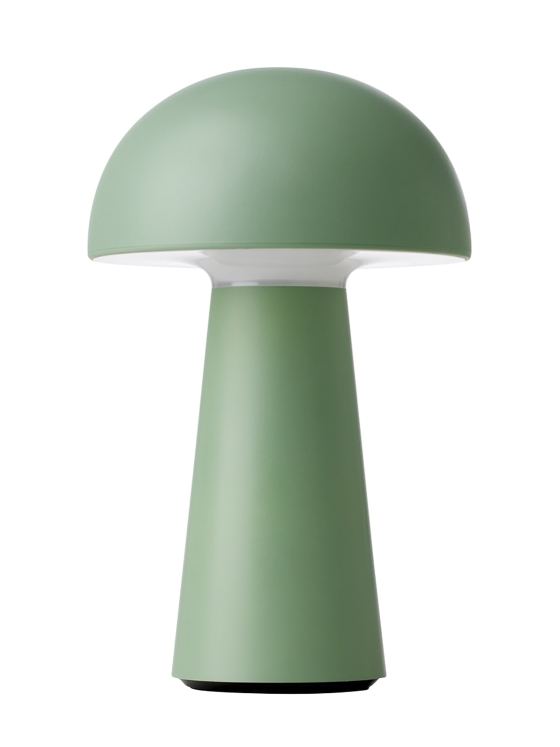 Denne fine, støvet grønne lampe kan oplades igen og igen. Den er hyggelig og perfekt på for eksempel havebordet eller ved sengebordet.
