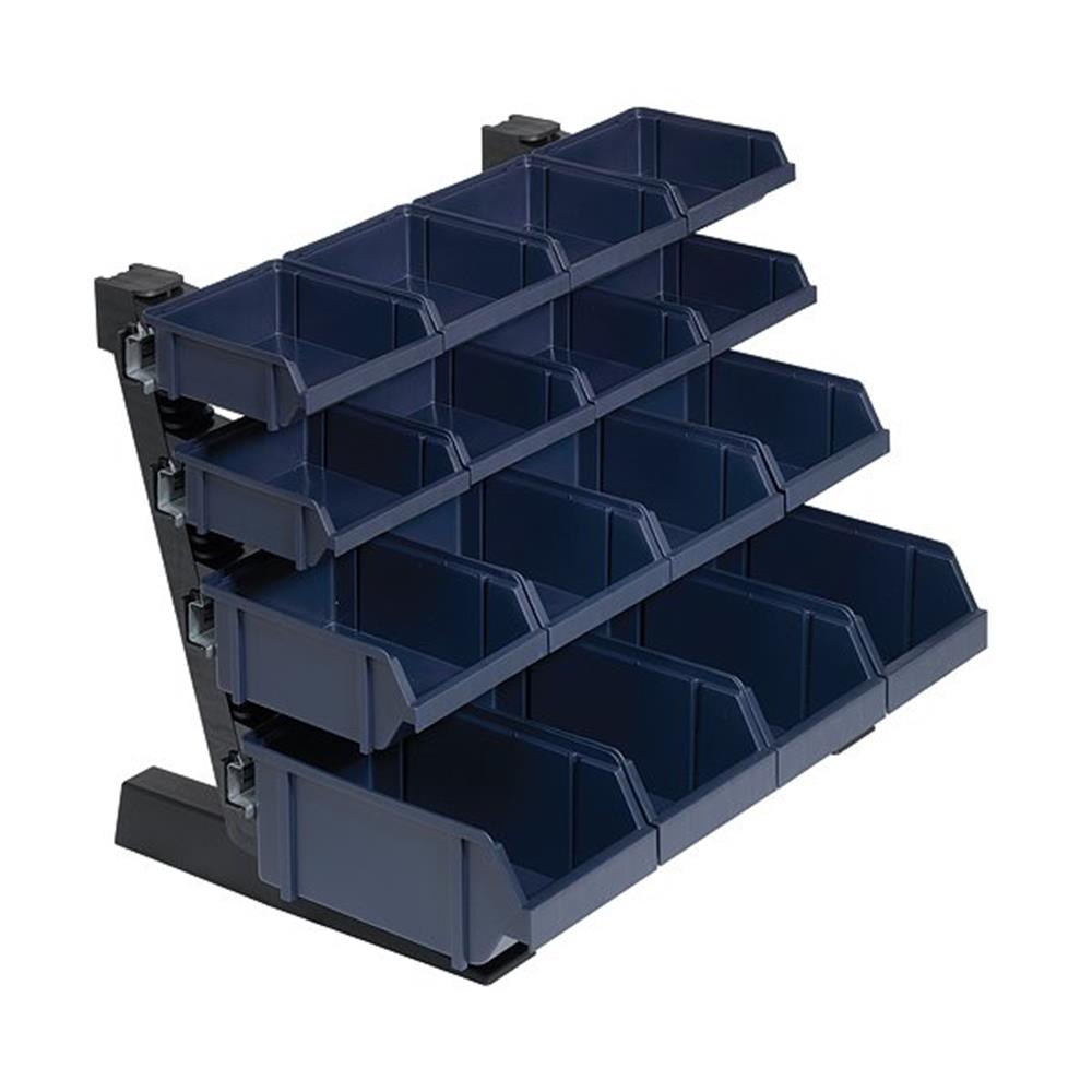 Dette bordstativ leveres med 16 lagerkasser, der giver en effektiv opbevaringsløsning til dit værksted eller lager.