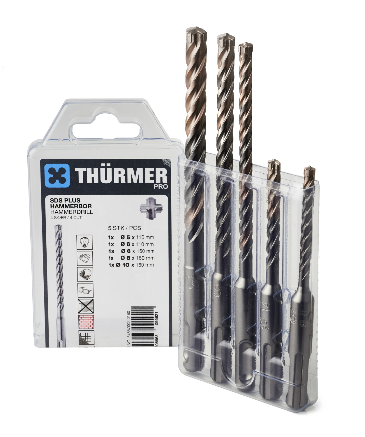 SDS borsæt fra Thürmer med 4 skær. Sættet indeholder bor i størrelserne 5x110 mm, 6x110 mm, 6x160 mm, 8x160 mm og 10x160 mm.