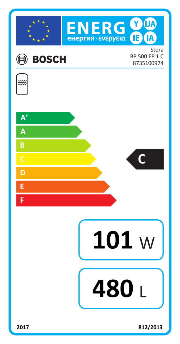 Bosch BP 500 EP 1 C bufferbeholder til centralvarme med energimærke C og en nettovolumen på 480 liter.