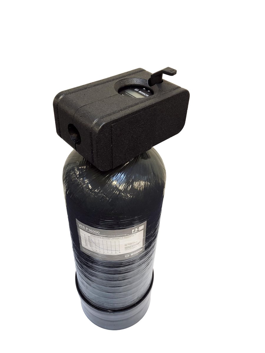 Bosch demineraliseringskit P16000 fjerner kalk og mineraler fra drikkevandet, hvilket forhindrer kalkaflejringer og korrosion i varmeanlæg.
