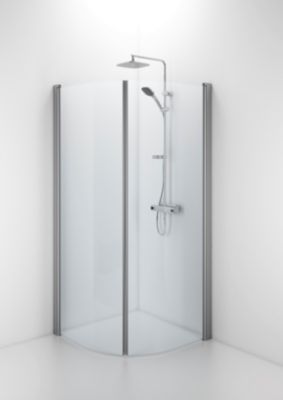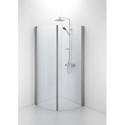 Elegance og funktionalitet til dit badeværelse. Space brusehjørne 80x80 cm med buede døre i klart hærdet glas og stilrene aluminiumsprofiler. Med hæve-sænke-mekanisme.
