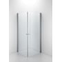 Kvadratisk brusehjørne i klart hærdet glas med alu-profiler og knopgreb. Mål: 90x90 cm. Med hæve-sænke-mekanisme og svingdørsåbning.