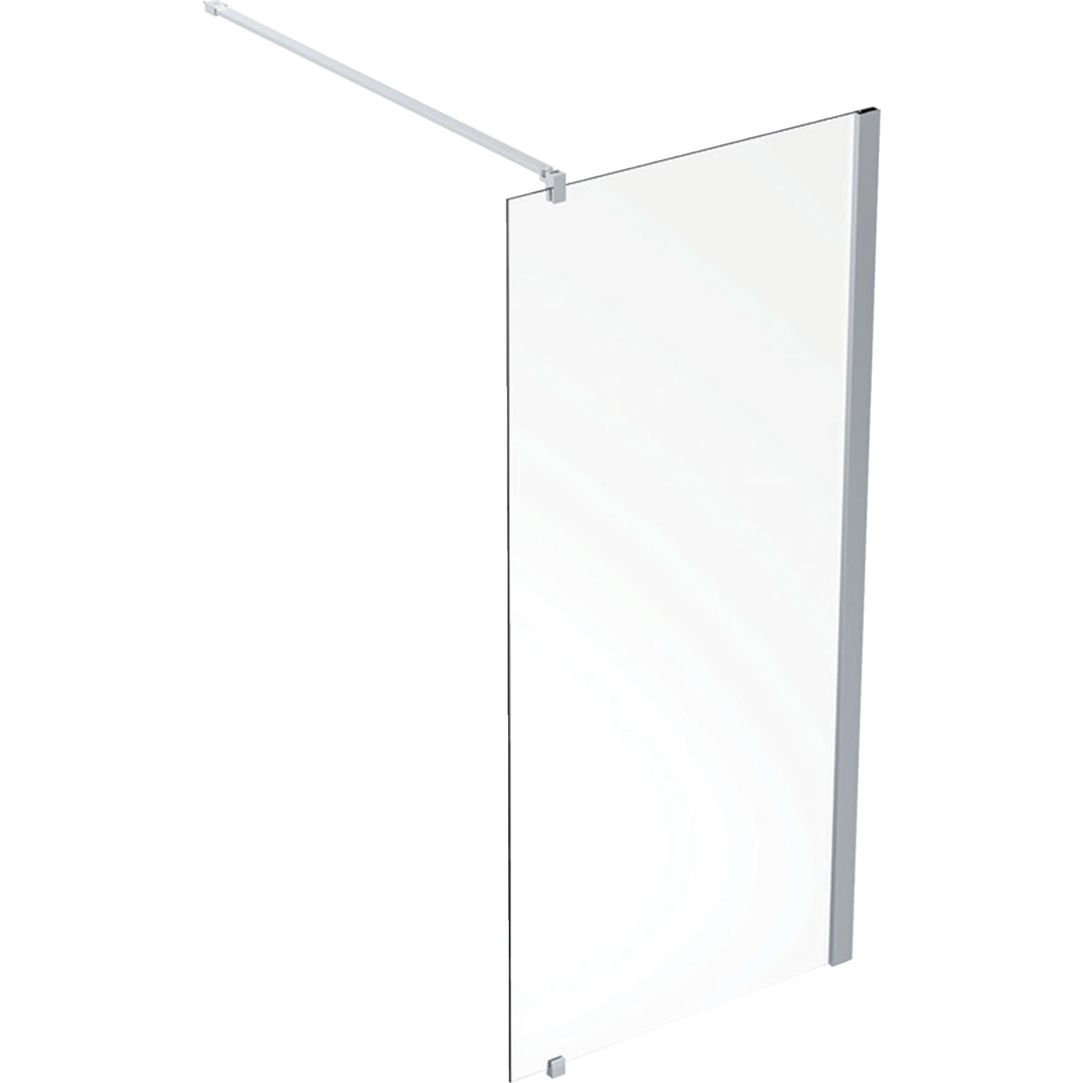 Fast brusevæg med klart hærdet sikkerhedsglas og mat aluminiumsprofiler. Inkl. forhængsstang. Mål: 800 mm bredde og 1950 mm højde. Gulvstøtte kan tilkøbes.