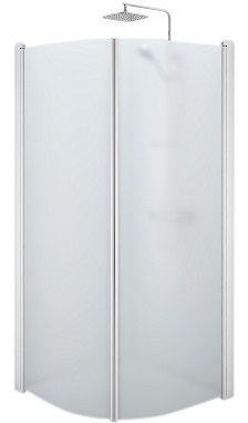 En elegant, buet svingdør med hvid profil og matteret sikkerhedsglas. Kan bruges alene eller kombineres med andre elementer.