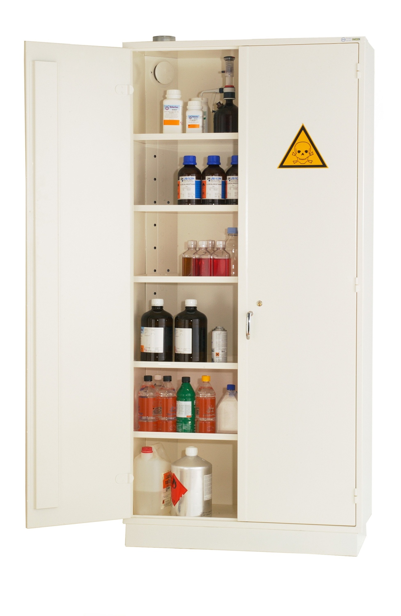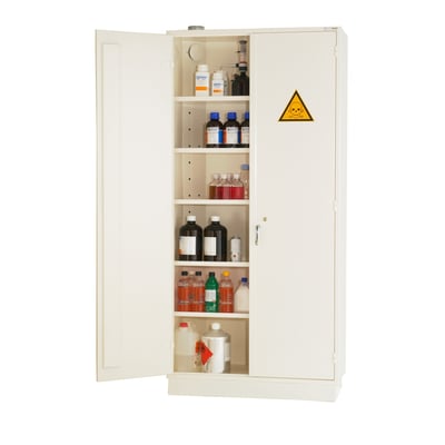 Brandsikkert kemiskab ISO 1182:199 med dobbelt stålforstærkning og flammesikker pulverlakering. Ventilleret med 1 hylde (standard). Mulighed for tilkøb af ekstra hylder og spildbakker.