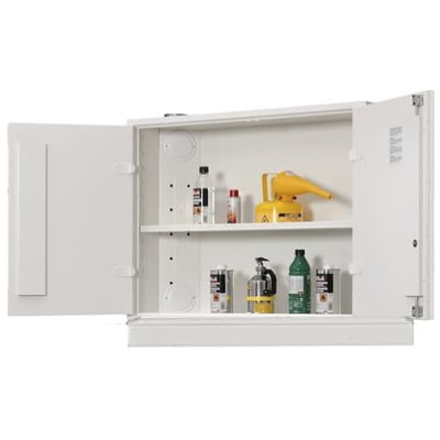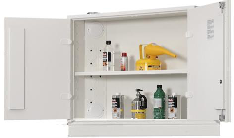 Brandsikkert kemiskab ISO 1182:199 med dobbelt stålforstærkning og flammesikker pulverlakering. Ventilleret med 1 hylde (standard). Ekstra hylder og spildbakker kan tilkøbes.