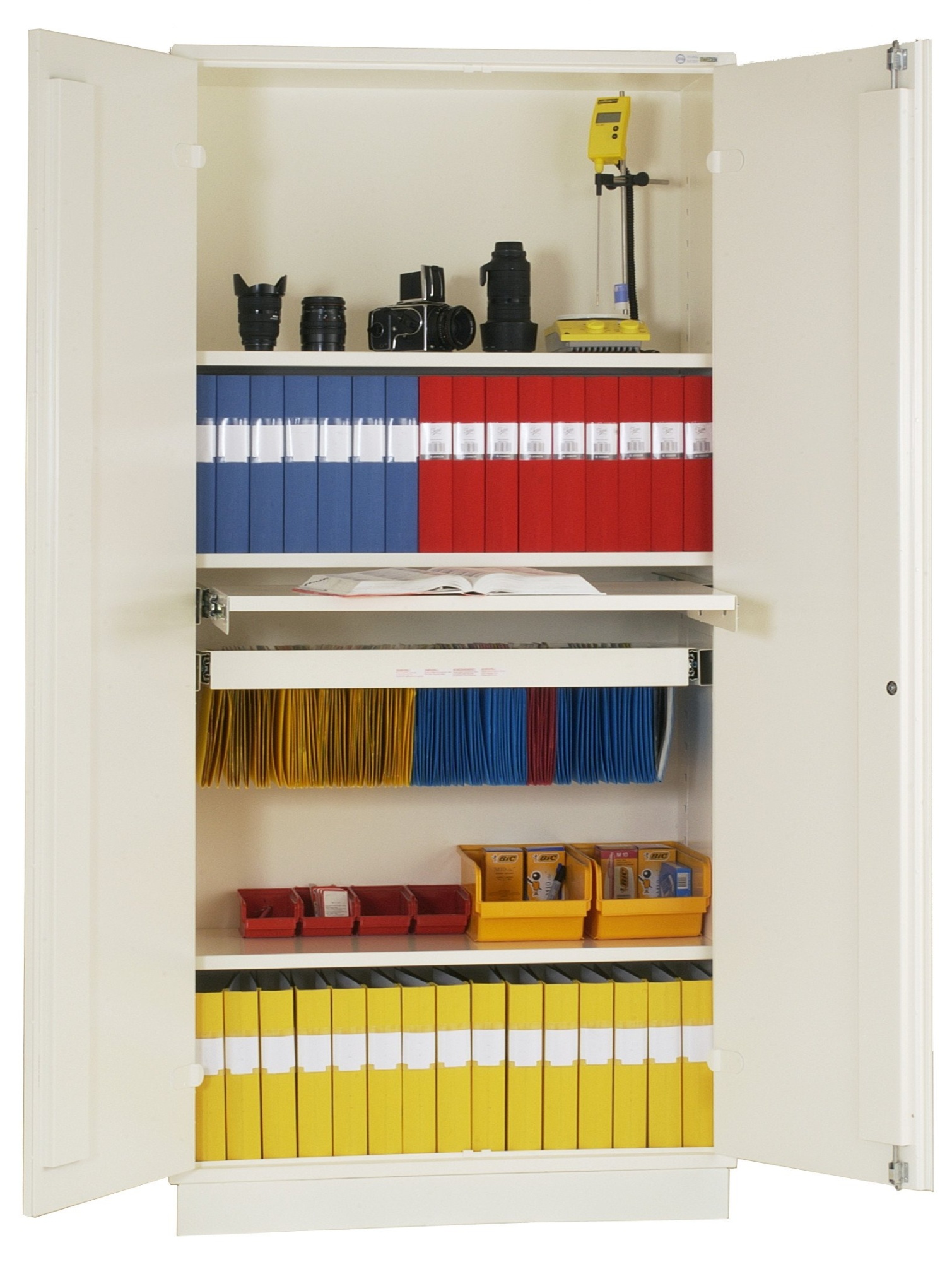 Brandsikkert opbevaringsskab (ISO 1182:199) med dobbelt stålforstærkning og flammesikker pulverlakering. Standardskab leveres med 5 hylder. Mulighed for tilkøb af ekstra hylder.