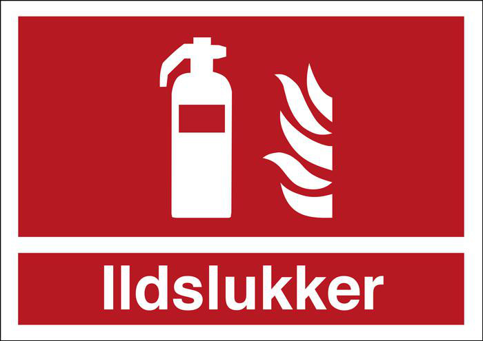 Dette brandskilt er designet til tydeligt at markere placeringen af en ildslukker. Skiltet er udført med dansk tekst og et letgenkendeligt symbol, hvilket sikrer hurtig identifikation i nødsituationer.