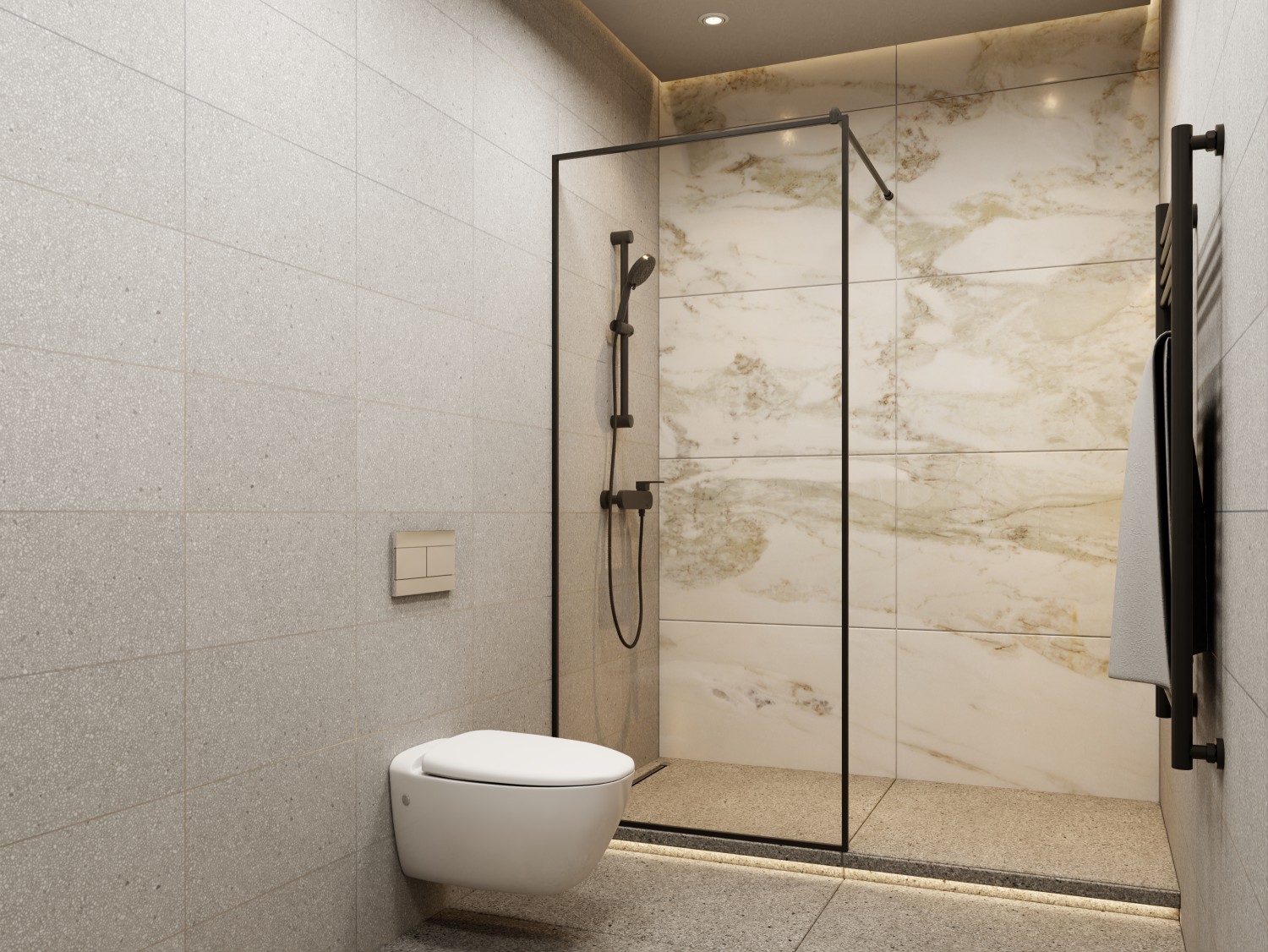 Brasta Dija Frame brusevæg i klart glas med sort profil. Mål: 90 x 200 cm. 6 mm glastykkelse.