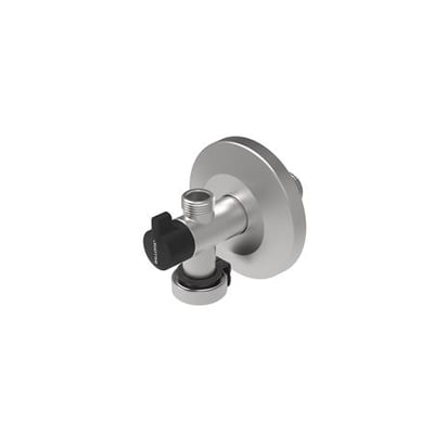 Broen BALLOFIX® dobbelt vinkelventil med kontraventil (NVR), DN8R/PN10. Udført i rustfrit stål med 1/2" rørgevind og 3/8"x3/4" udløb.