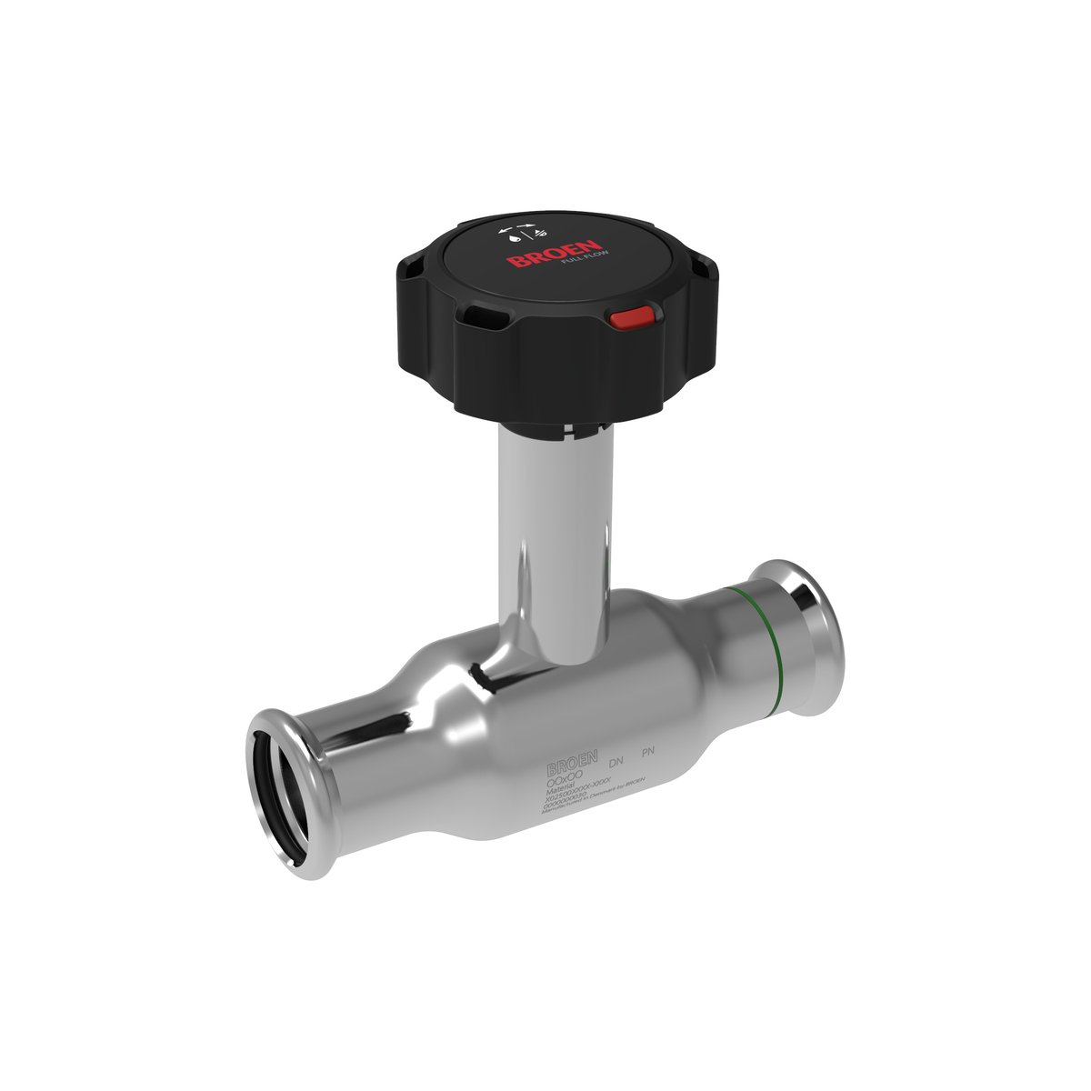 BROEN Full Flow kugleventil i rustfrit stål (EN 1.4404) med PA66 glasfiberarmeret nylonhåndtag. Tilslutning: Pres/pres DN40, 42 x 42 mm. Max 16 bar.
