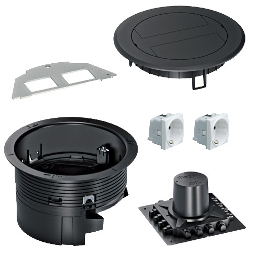 Komplet gulvboks fra Hager med plastiklåg. Inkluderer støbeklods, installationsdåse, stikkontakter, montageplade og plastlåg. Ideel til gulvkanaler.