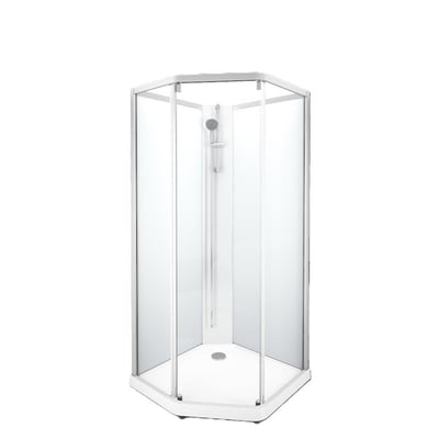 Showerama 10-5 classic er en femkantet brusekabine i størrelsen 100x100 cm med aluminiumsprofiler og frostet glas.