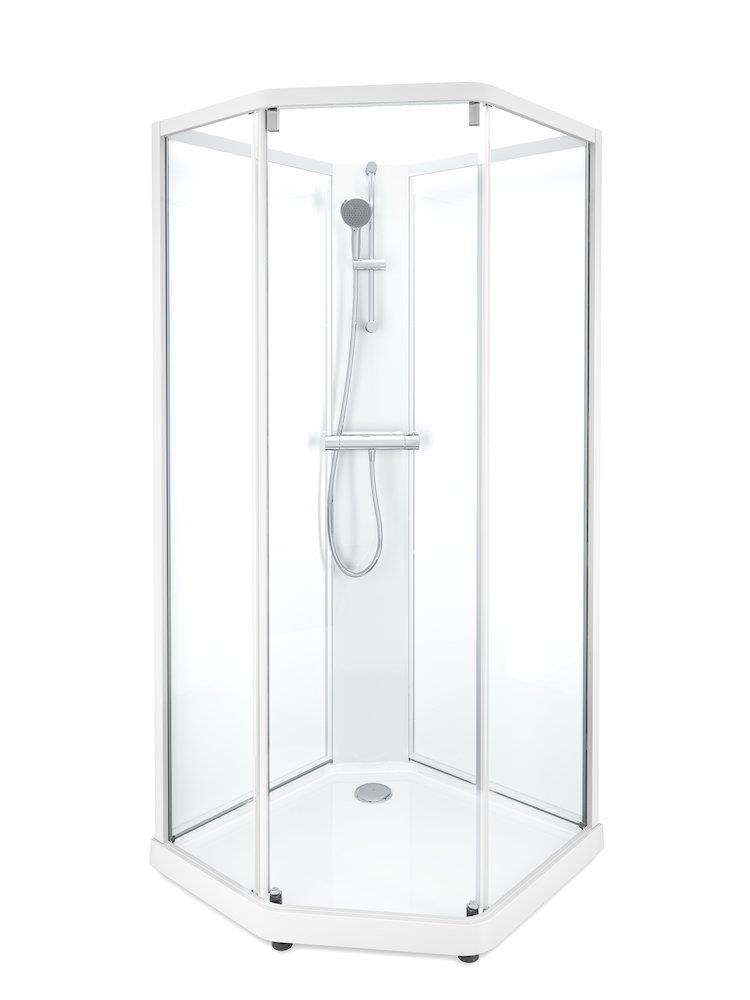 Showerama 10-5 comfort er en femkantet brusekabine med moderne design og høj komfort. Vælg mellem klart eller frostet glas.