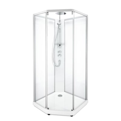 Showerama 10-5 comfort er en femkantet brusekabine med et moderne design og høj komfort. Måler 100x100 cm med klar glas og aluminiumsprofiler.
