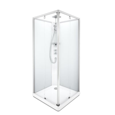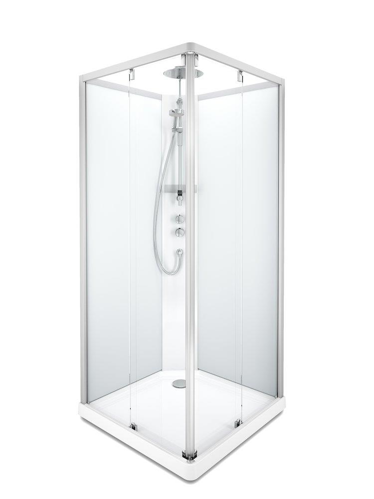 Showerama 10-5 classic er en femkantet brusekabine på 100x100 cm med hvide profiler og klart/frostet glas.