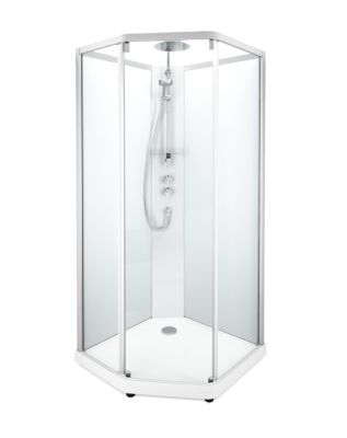 Denne model er femkantet og måler 90x90 cm med en højde på 215 cm. Profilerne er i aluminium, og kabinen leveres med en kombination af klart og frostet glas, hvilket giver mulighed for at skjule rørføring eller væggen bagved kabinen.