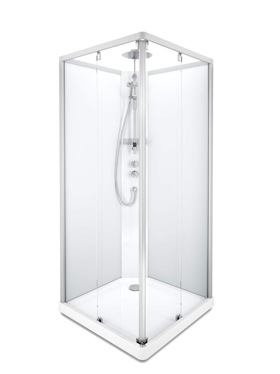 Vælg mellem forskellige modeller, herunder kvadratiske og femkantede, med profiler i hvid eller børstet aluminium. Kabinen leveres med klart glas, men en bagvæg i frostet glas kan tilvælges for at skjule rør eller væggen bagved.