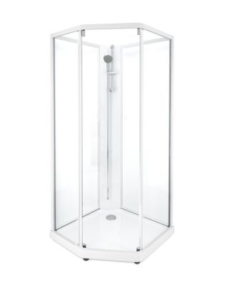 Showerama 10-5 classic er en femkantet brusekabine på 90x90 cm med hvide profiler og klart glas. Moderne design og høj komfort.