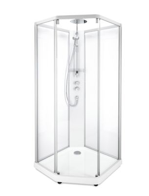 Showerama 10-5 comfort brusekabine i femkantet design. Mål: 90x80 cm. Med klart glas og aluminiumsprofiler.