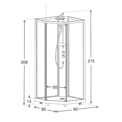 Denne Showerama 10-5 Comfort brusekabine er designet til at give en behagelig og funktionel badeoplevelse. Med sin femkantede form og kompakte mål på 90x80 cm passer den godt ind i de fleste badeværelser, hvor pladsoptimering er vigtig.