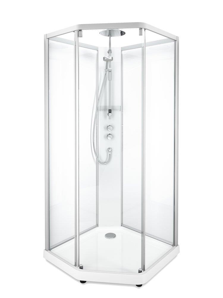 Showerama 10-5 comfort brusekabine i femkantet design med klare glas og aluminiumsprofiler. Mål: 90x90 cm.