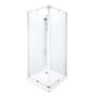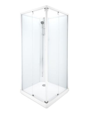Du har mulighed for at vælge mellem forskellige modeller, herunder både kvadratiske og femkantede former, samt profiler i hvid eller børstet aluminium. Denne model leveres med en praktisk skydedør og er udstyret med en håndbruser.