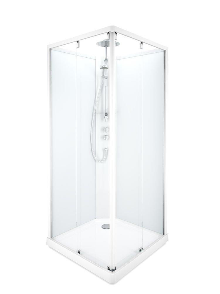 Kabinen leveres med en praktisk skydedør og en kombination af klart og frostet glas. Det klare glas giver et stilrent udtryk, mens den frostede bagvæg kan skjule rørføringer eller væggen bag kabinen, hvilket bidrager til et rent og ryddeligt udseende på badeværelset.